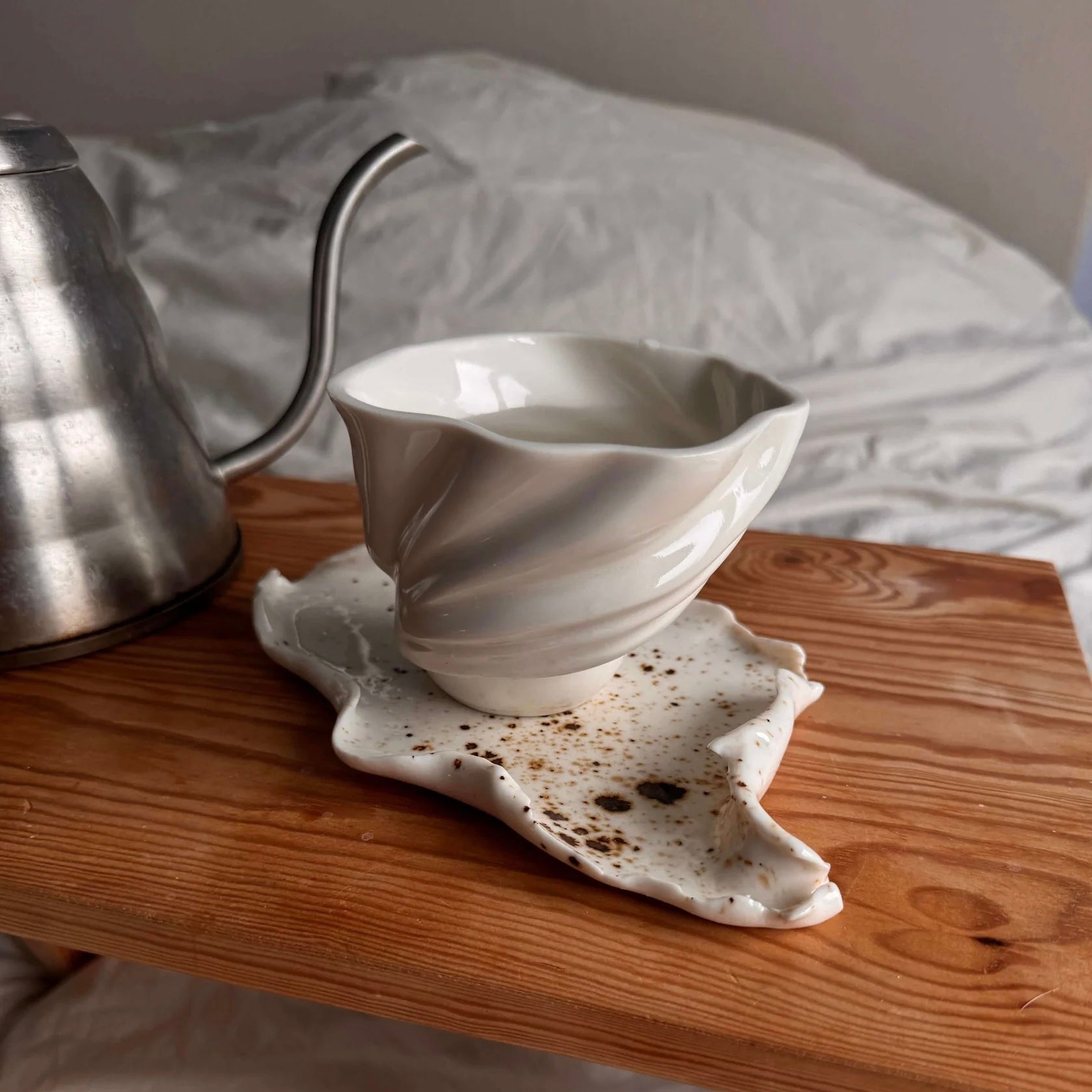 Svanekoppen er inspireret af H.C Andersens eventyr. De vilde svaner, porcelænshvide og klare. Fine riflede bølger på siden som smukke svanevinger der folder sig ud. En kop der ligger blødt og majestætisk i din hånd.