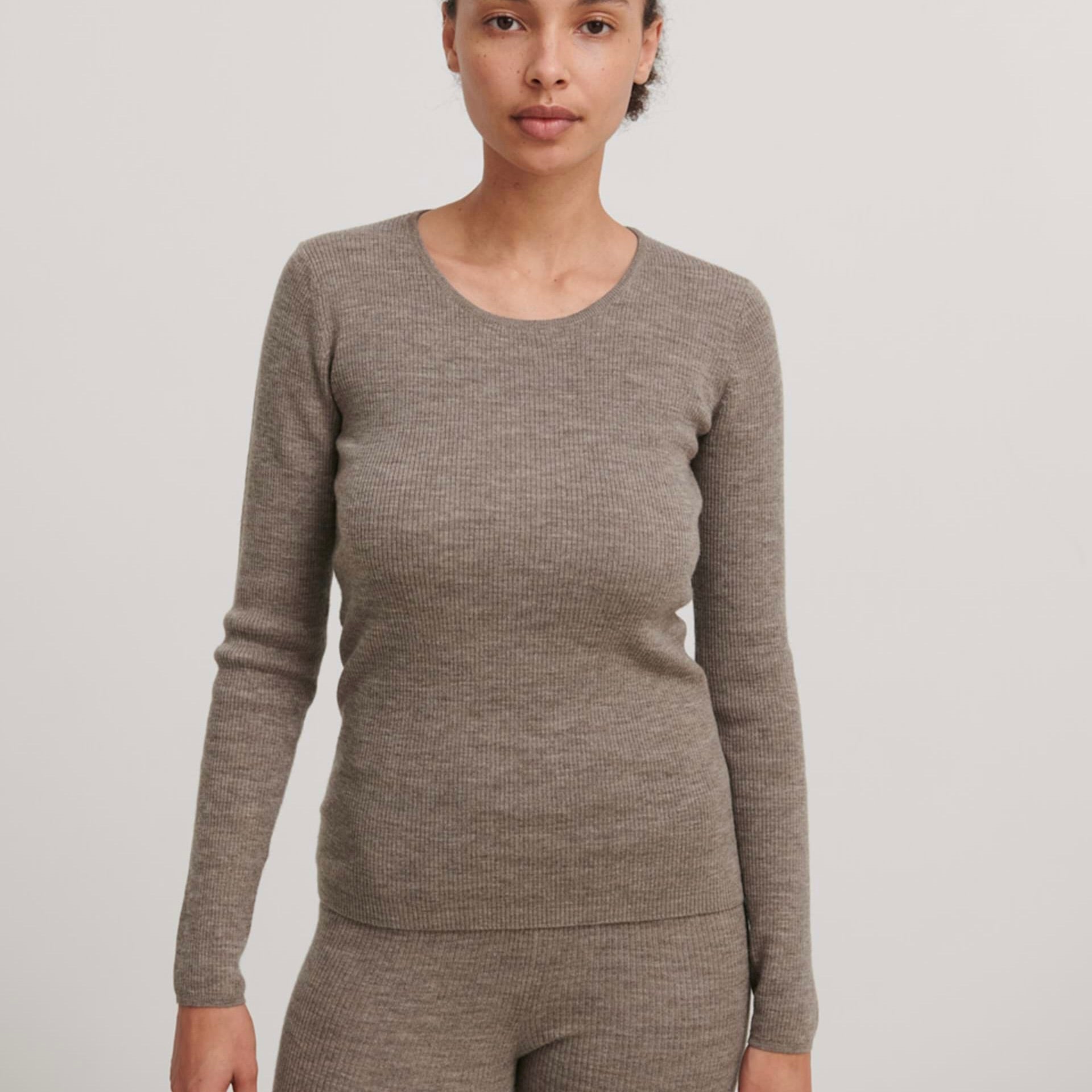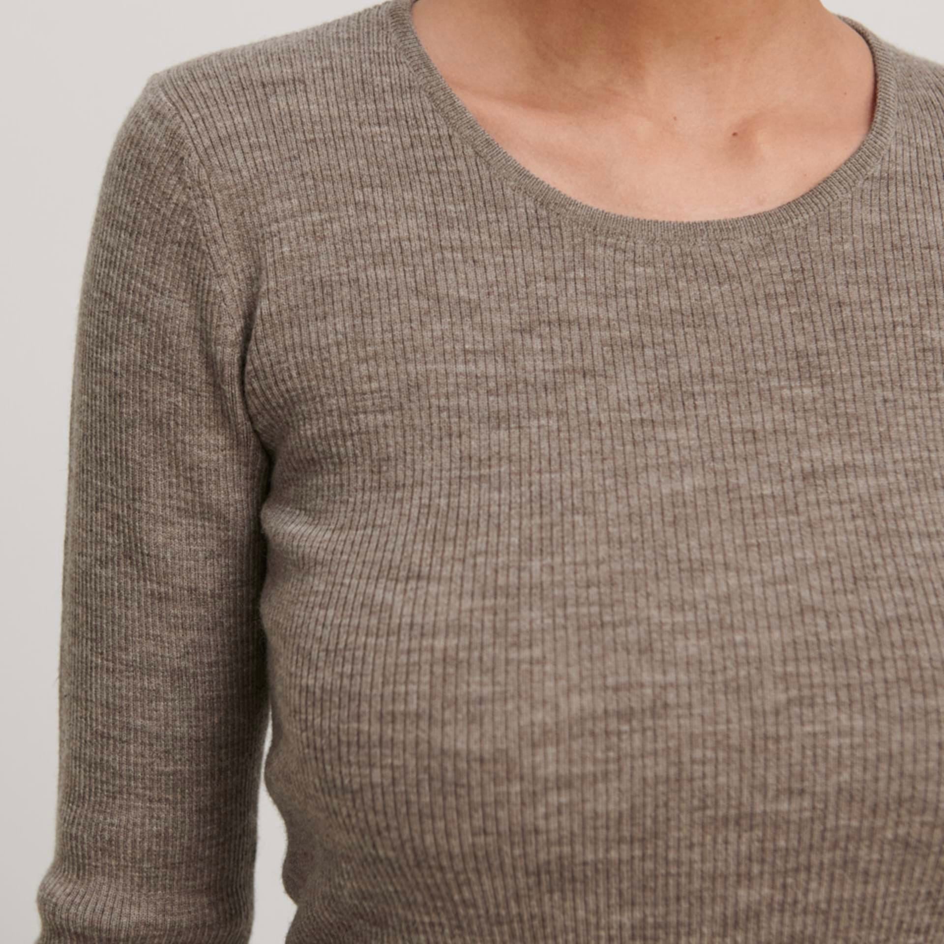 Denne langærmede bluse i ekstrafin merinould er strikket i en ekstrafin ribstruktur og har en lige smal pasform. Den har rund hals, ribkanter og diskret finish på bund og ærmekanter. Brug den alene eller som det inderste lag. Blusen fås i ensfarvet og i en stribet variant. Vores merinould er fri for skadelig kemi og kommer fra mulesing-fri får.
