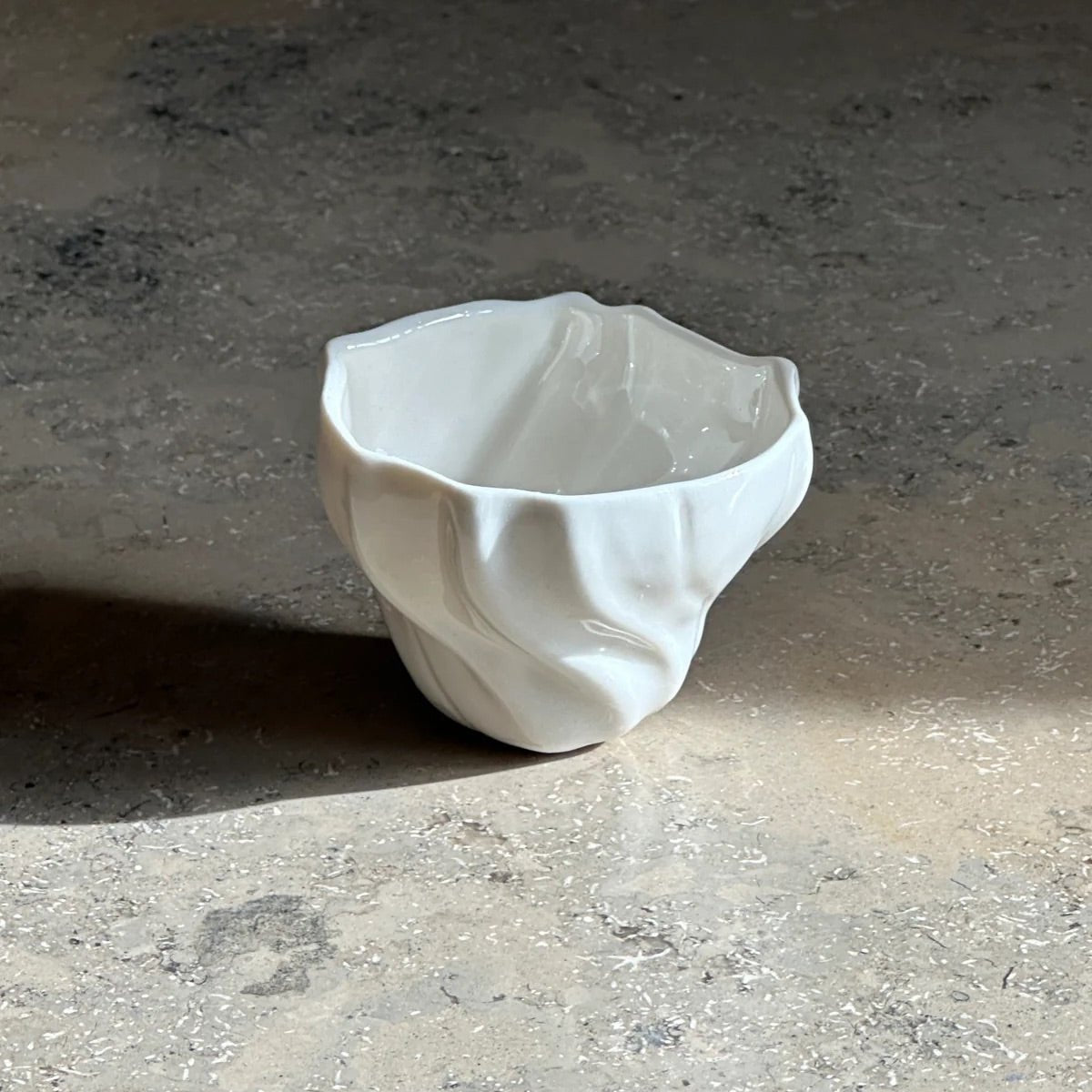Koppen er håndlavet i Århus i det fineste hvide porcelænsler. Den tåler opvaskemaskine og passer perfekt i størrelsen ind i din kop-reol.