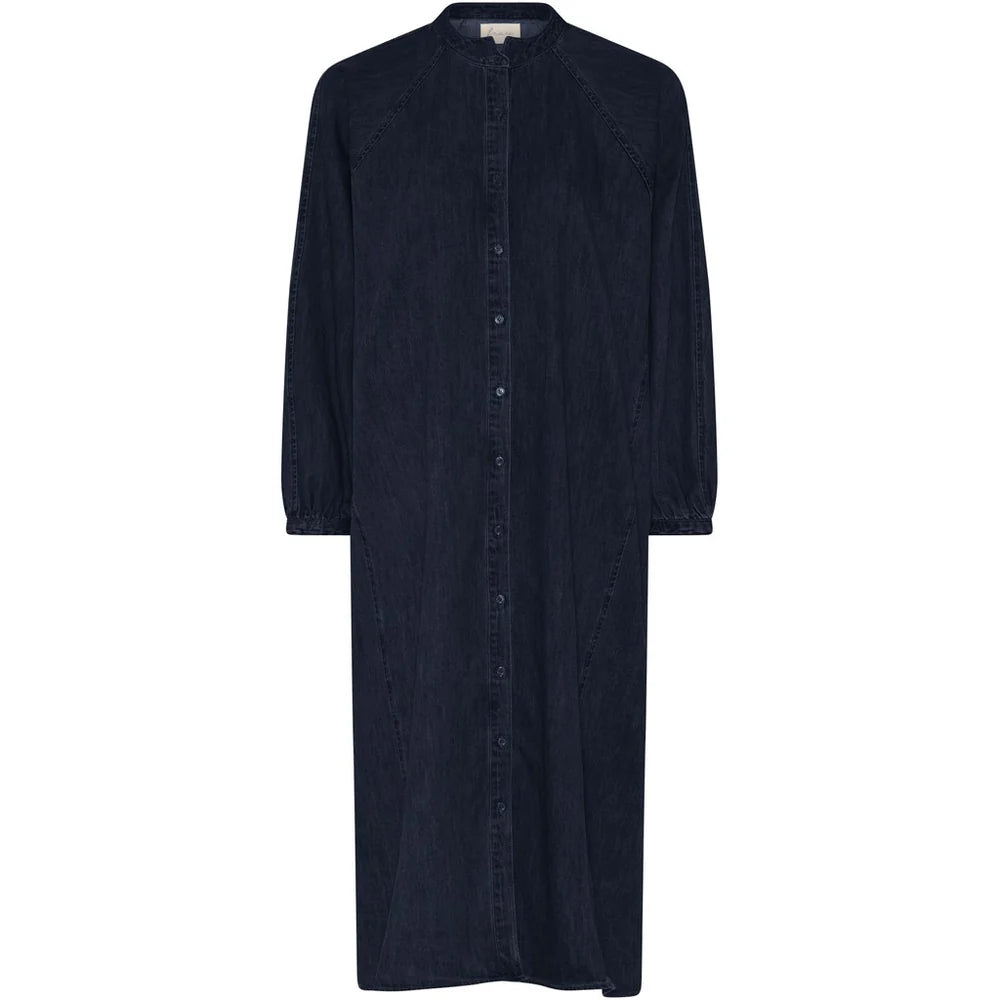 Tokyo denimkjolen har raglanærmer og masser af volume. Den er gennemknappet og kan både anvendes knappet som kjole og åbentstående. Den lille fine kravedetalje kan stå oprejst eller presses fint ned.